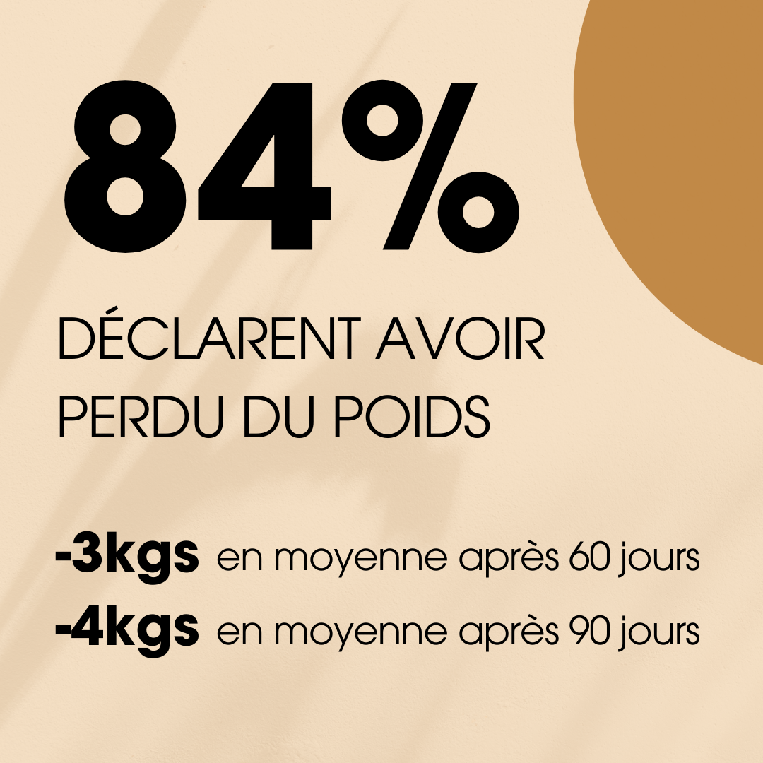 Réalisé par un cabinet indépendant, celui-ci indique que 84% des consommateurs de l’Espresso Brûleur de Graisses ont constaté une perte de poids après 2 mois de consommation.