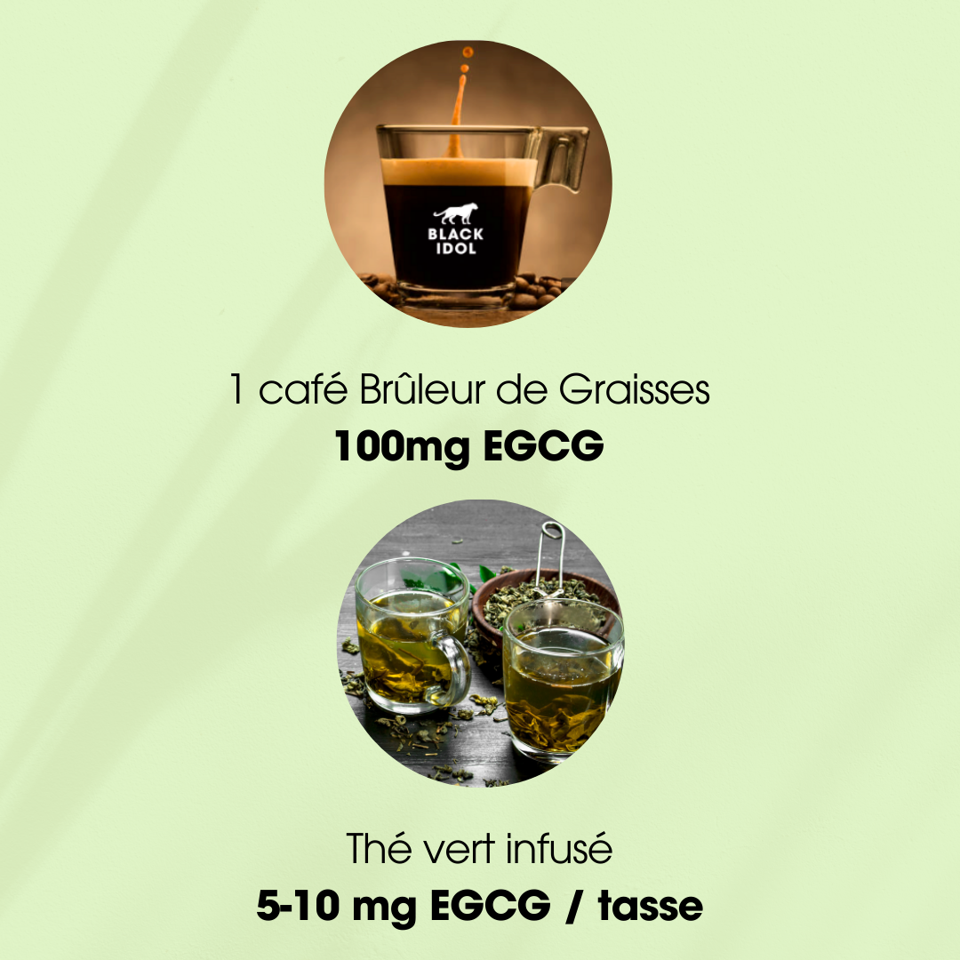 Le thé vert contient naturellement un des plus puissants polyphénols antioxydants responsable de l’effet brûle-graisses : l’EGCG (L'epigallo-catéchine-gallate).